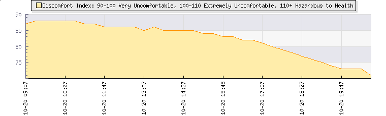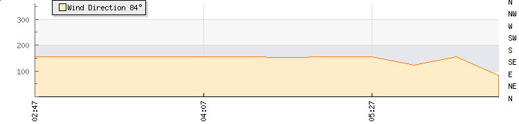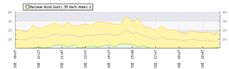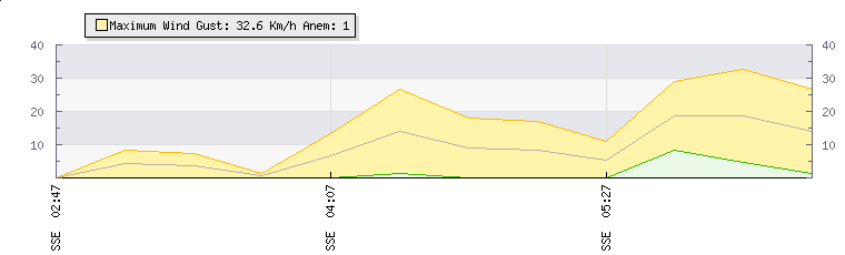 In the last few minutes the wind was South South East at an average speed of 5 kmh, reaching up to 11 kmh and a low of 0 kmh. The gust strength is11 kmh above the minimum speed |
