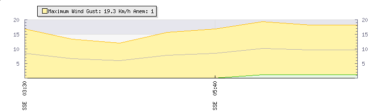 In the last few minutes the wind was North North West at an average speed of 14 kmh, reaching up to 24 kmh and a low of 4 kmh. The gust strength is20 kmh above the minimum speed |