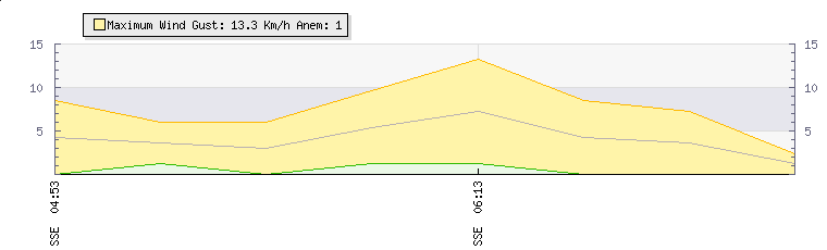In the last few minutes the wind was South South East at an average speed of 1 kmh, reaching up to 2 kmh and a low of 0 kmh. The gust strength is2 kmh above the minimum speed |