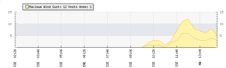 In the last few minutes the wind was South South East at an average speed of 6 knots, reaching up to 12 knots and a low of 0 knots. The gust strength is12 knots above the minimum speed |