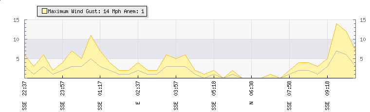 In the last few minutes the wind was South South East at an average speed of 1 mph, reaching up to 3 mph and a low of 0 mph. The gust strength is3 mph above the minimum speed |