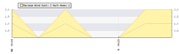 In the last few minutes the wind was Northerly at an average speed of 1 kmh, reaching up to 2 kmh and a low of 0 kmh. The gust strength is2 kmh above the minimum speed |