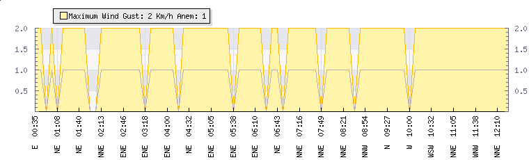 In the last few minutes the wind was North Westerly at an average speed of 1 kmh, reaching up to 2 kmh and a low of 0 kmh. The gust strength is2 kmh above the minimum speed |