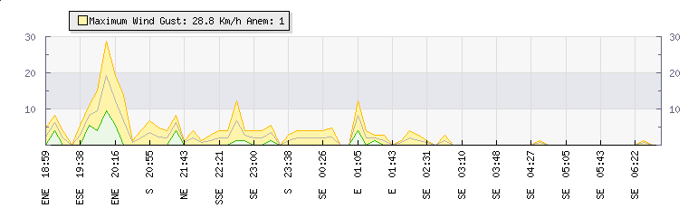 In the last few minutes the wind was South Easterly at an average speed of 0 kmh, reaching up to 0 kmh and a low of 0 kmh. The gust strength is0 kmh above the minimum speed |