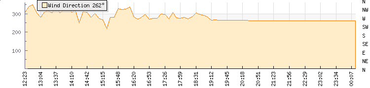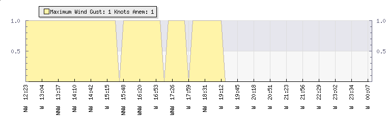 In the last few minutes the wind was Westerly at an average speed of 1 knots, reaching up to 1 knots and a low of 0 knots. The gust strength is1 knots above the minimum speed |