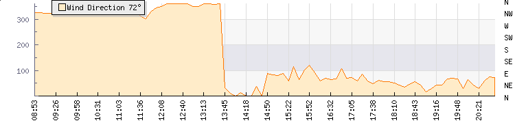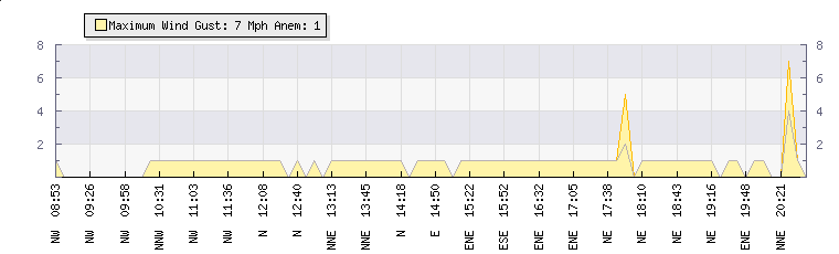 In the last few minutes the wind was North North East at an average speed of 1 mph, reaching up to 1 mph and a low of 0 mph. The gust strength is1 mph above the minimum speed |