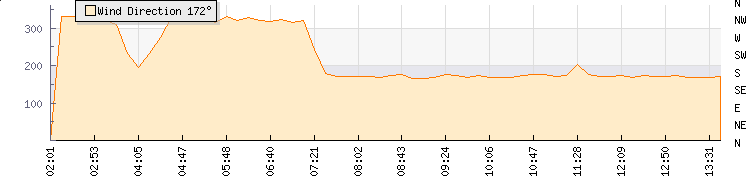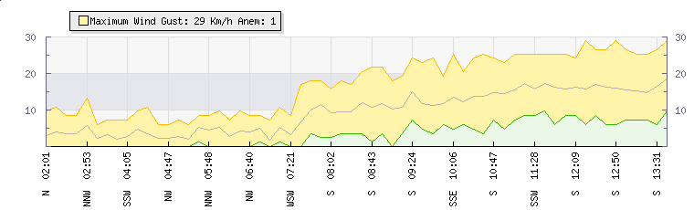 In the last few minutes the wind was Southerly at an average speed of 14 kmh, reaching up to 23 kmh and a low of 5 kmh. The gust strength is18 kmh above the minimum speed |