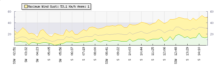 In the last few minutes the wind was Southerly at an average speed of 26 kmh, reaching up to 46 kmh and a low of 10 kmh. The gust strength is36 kmh above the minimum speed |
