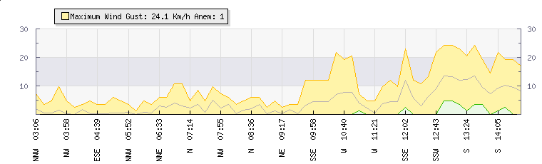 In the last few minutes the wind was Southerly at an average speed of 12 kmh, reaching up to 23 kmh and a low of 4 kmh. The gust strength is19 kmh above the minimum speed |