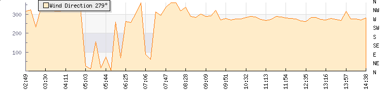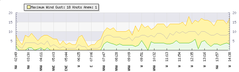 In the last few minutes the wind was Westerly at an average speed of 9 knots, reaching up to 13 knots and a low of 4 knots. The gust strength is9 knots above the minimum speed |
