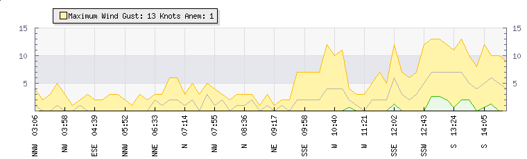In the last few minutes the wind was Southerly at an average speed of 7 knots, reaching up to 12 knots and a low of 2 knots. The gust strength is10 knots above the minimum speed |