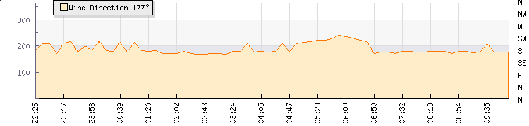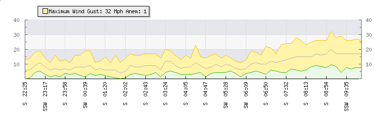 In the last few minutes the wind was Southerly at an average speed of 17 mph, reaching up to 26 mph and a low of 9 mph. The gust strength is17 mph above the minimum speed |