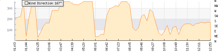 In the last few minutes the wind was South South East at an average speed of 3 mph, reaching up to 8 mph and a low of 0 mph. The gust strength is8 mph above the minimum speed |
