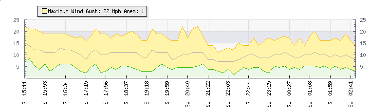 In the last few minutes the wind was Southerly at an average speed of 11 mph, reaching up to 18 mph and a low of 5 mph. The gust strength is13 mph above the minimum speed |