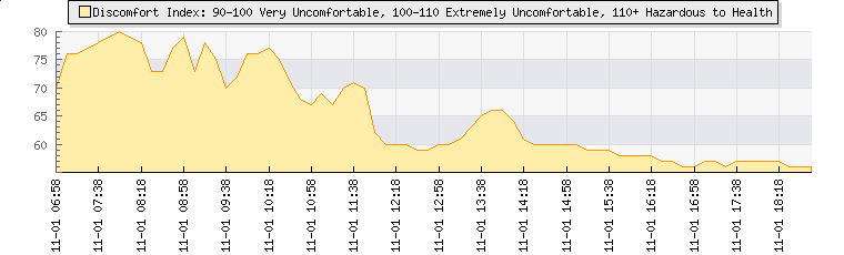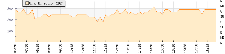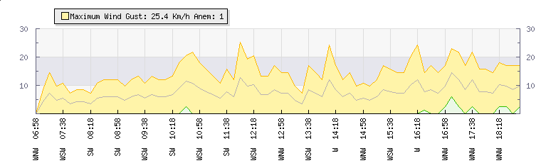 In the last few minutes the wind was West North West at an average speed of 10 kmh, reaching up to 19 kmh and a low of 0 kmh. The gust strength is19 kmh above the minimum speed |