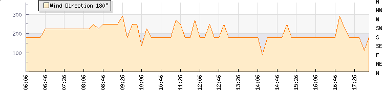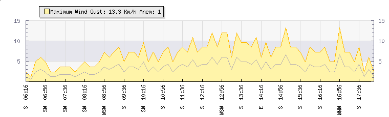 In the last few minutes the wind was Southerly at an average speed of 4 kmh, reaching up to 7 kmh and a low of 0 kmh. The gust strength is7 kmh above the minimum speed |