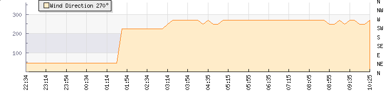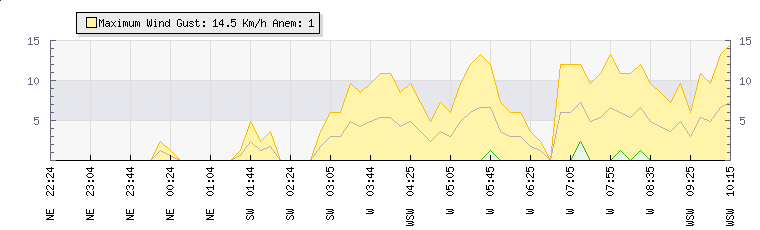 In the last few minutes the wind was West South West at an average speed of 4 kmh, reaching up to 7 kmh and a low of 0 kmh. The gust strength is7 kmh above the minimum speed |