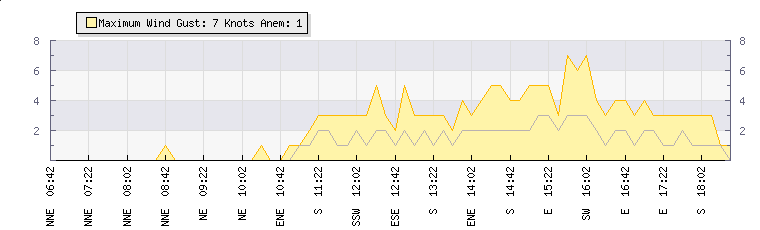 In the last few minutes the wind was Easterly at an average speed of 1 knots, reaching up to 3 knots and a low of 0 knots. The gust strength is3 knots above the minimum speed |