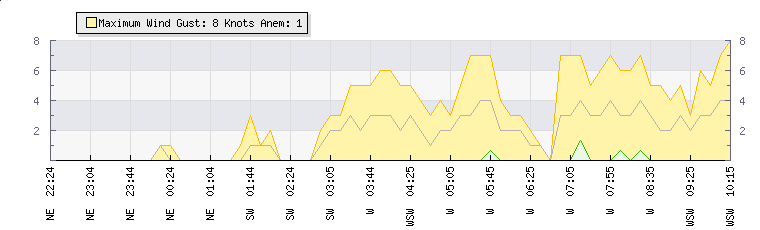 In the last few minutes the wind was West South West at an average speed of 2 knots, reaching up to 4 knots and a low of 0 knots. The gust strength is4 knots above the minimum speed |