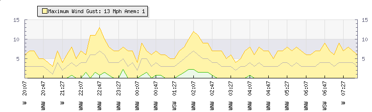 In the last few minutes the wind was West North West at an average speed of 3 mph, reaching up to 6 mph and a low of 0 mph. The gust strength is6 mph above the minimum speed |