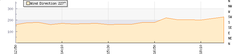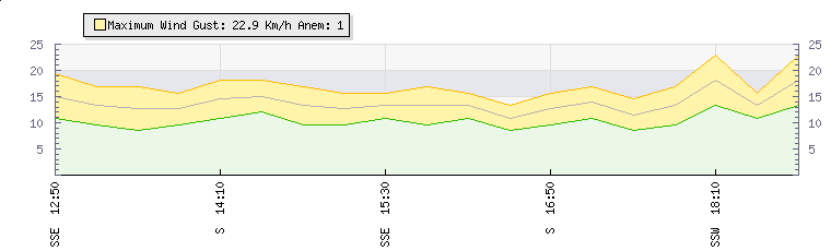 In the last few minutes the wind was South Westerly at an average speed of 14 kmh, reaching up to 17 kmh and a low of 11 kmh. The gust strength is6 kmh above the minimum speed |