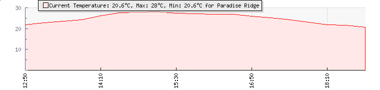 | Wind Gust: | 19 km/h | Min Temp: | 18.9 °C | Max Temp: | 28.7 °C | | Wind Average: | 16 km/h | | |  |