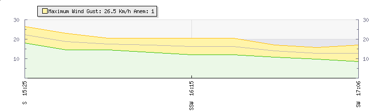 In the last few minutes the wind was South Westerly at an average speed of 13 kmh, reaching up to 17 kmh and a low of 8 kmh. The gust strength is9 kmh above the minimum speed |