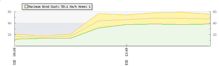 In the last few minutes the wind was East South East at an average speed of 47 kmh, reaching up to 56 kmh and a low of 39 kmh. The gust strength is17 kmh above the minimum speed |