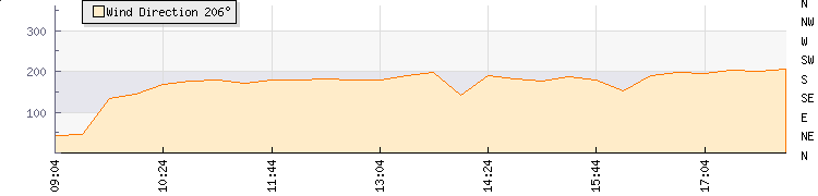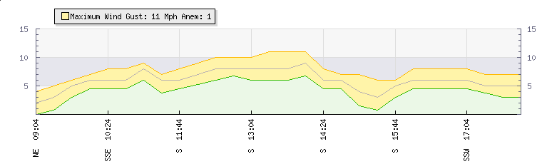 In the last few minutes the wind was South South West at an average speed of 5 mph, reaching up to 7 mph and a low of 3 mph. The gust strength is4 mph above the minimum speed |