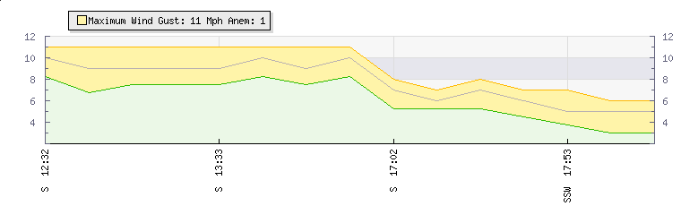 In the last few minutes the wind was Southerly at an average speed of 5 mph, reaching up to 6 mph and a low of 3 mph. The gust strength is3 mph above the minimum speed |