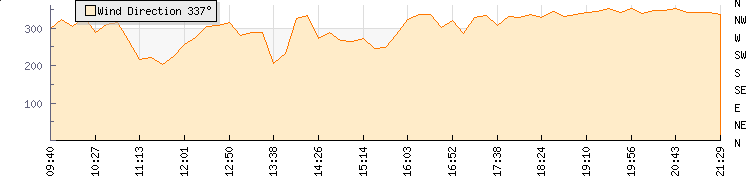In the last few minutes the wind was North North West at an average speed of 10 kmh, reaching up to 19 kmh and a low of 2 kmh. The gust strength is17 kmh above the minimum speed |
