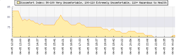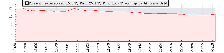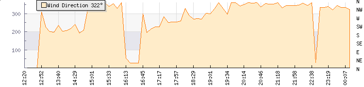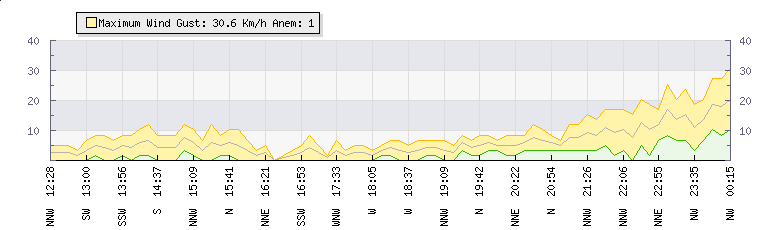 | Wind Gust: | 20 km/h | Min Temp: | 15.4 °C | Max Temp: | 20.1 °C | | Wind Average: | 13 km/h | Min Hum: | 86 % | Max Hum: | 96 % | |  |