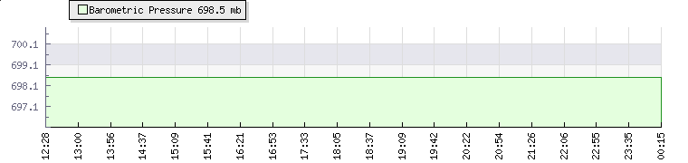| Wind Speed: | 2|10|19 kmh | Wind Direction: | N 8° | Temperature: | 15.8°C | | Wet Bulb: | 14.9°C | Discomfort: | 70 | Humidity: | 92% | | Rainfall Today: | 0.7mm | 12 hrs Rainfall: | 0mm | 24 hrs Rainfall: | 0.7mm | | Barometer: | 698.5mb | Dew Point: | 14.5°C | Clouds AGL: | 520ft (158 m) | | Density-Alt: | 13169ft (4014 m) | Fire Danger: | |