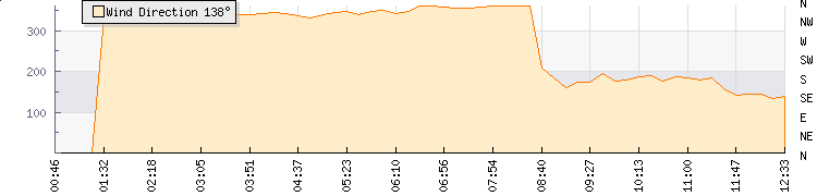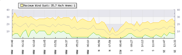 In the last few minutes the wind was North North West at an average speed of 19 kmh, reaching up to 27 kmh and a low of 10 kmh. The gust strength is17 kmh above the minimum speed |