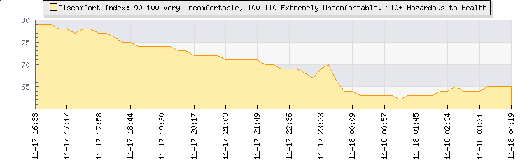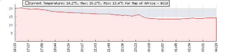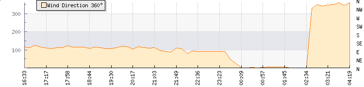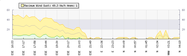 | Wind Gust: | 10 km/h | Min Temp: | 13.4 °C | Max Temp: | 14 °C | | Wind Average: | 5 km/h | Min Hum: | 85 % | Max Hum: | 87 % | |  |