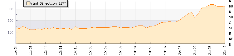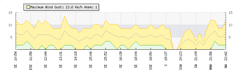 In the last few minutes the wind was Westerly at an average speed of 3 kmh, reaching up to 7 kmh and a low of 0 kmh. The gust strength is7 kmh above the minimum speed |