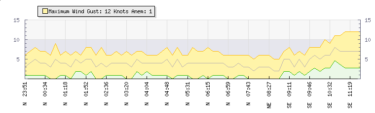 In the last few minutes the wind was South Easterly at an average speed of 6 knots, reaching up to 8 knots and a low of 3 knots. The gust strength is5 knots above the minimum speed |