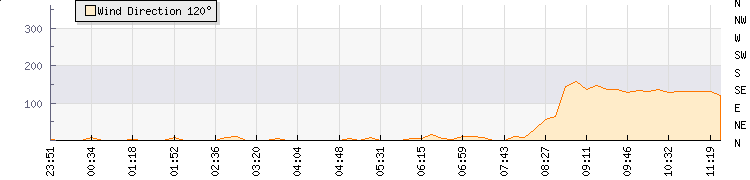 In the last few minutes the wind was South Easterly at an average speed of 6 mph, reaching up to 10 mph and a low of 3 mph. The gust strength is7 mph above the minimum speed |