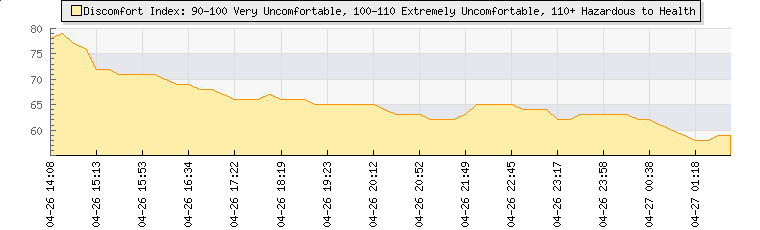 | Wind Speed: | 8|15|22 mph | Wind Direction: | NNW 330° | Temperature: | 13.6°C | | Wet Bulb: | 11.5°C | Discomfort: | 62 | Humidity: | 81% | | Rainfall Today: | 0mm | 12 hrs Rainfall: | 0.7mm | 24 hrs Rainfall: | 0.7mm | | Barometer: | 997.7mb | Dew Point: | 10.4°C | Clouds AGL: | 1280ft (390 m) | | Density-Alt: | 1148ft (350 m) | Fire Danger: | |