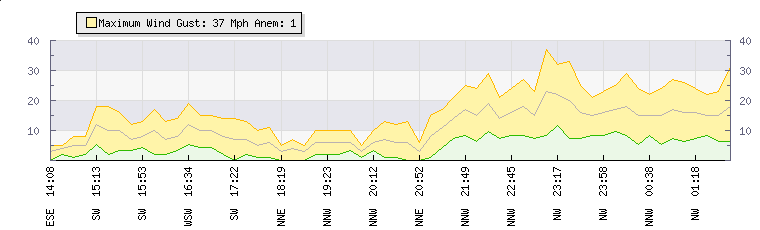 | Wind Gust: | 29 mph | Min Temp: | 13.6 °C | Max Temp: | 13.7 °C | | Wind Average: | 19 mph | Min Hum: | 81 % | Max Hum: | 82 % | |  |