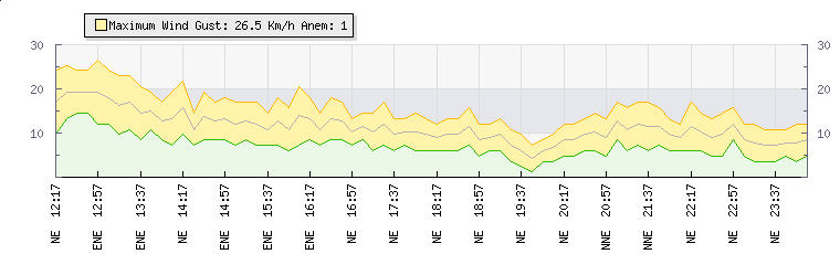In the last few minutes the wind was North Easterly at an average speed of 10 kmh, reaching up to 13 kmh and a low of 6 kmh. The gust strength is7 kmh above the minimum speed |