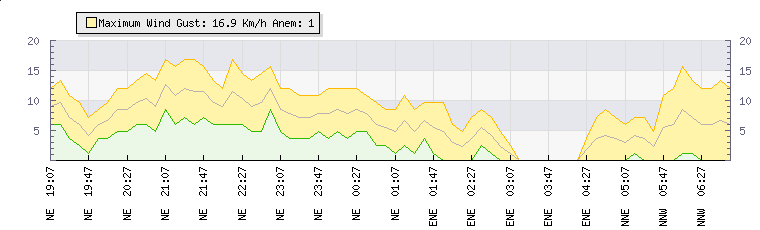 In the last few minutes the wind was North North East at an average speed of 4 kmh, reaching up to 7 kmh and a low of 0 kmh. The gust strength is7 kmh above the minimum speed |