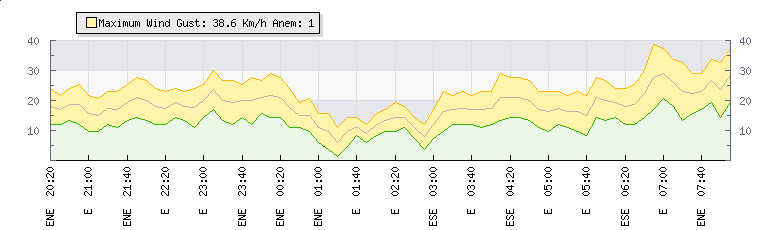 In the last few minutes the wind was East South East at an average speed of 22 kmh, reaching up to 30 kmh and a low of 14 kmh. The gust strength is16 kmh above the minimum speed |