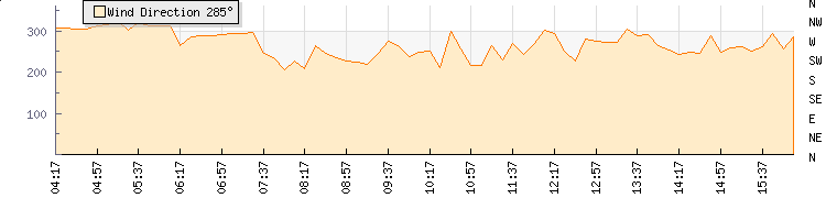 In the last few minutes the wind was West South West at an average speed of 10 mph, reaching up to 16 mph and a low of 5 mph. The gust strength is11 mph above the minimum speed |