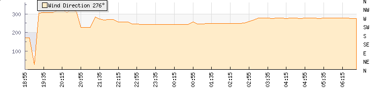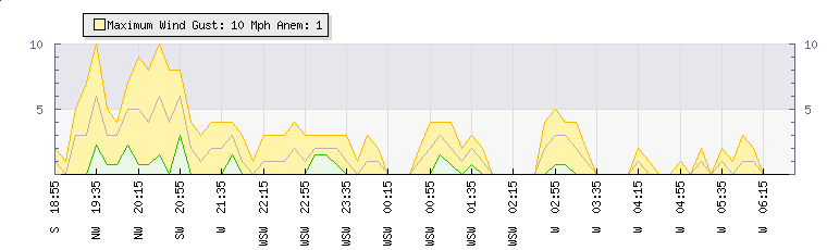 In the last few minutes the wind was Westerly at an average speed of 0 mph, reaching up to 0 mph and a low of 0 mph. The gust strength is0 mph above the minimum speed |