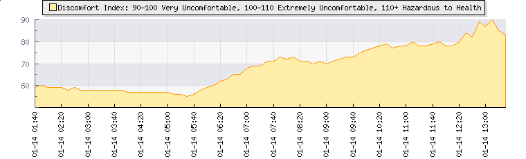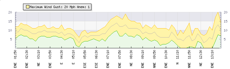 In the last few minutes the wind was North North East at an average speed of 7 mph, reaching up to 14 mph and a low of 1 mph. The gust strength is13 mph above the minimum speed |