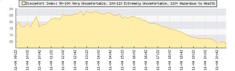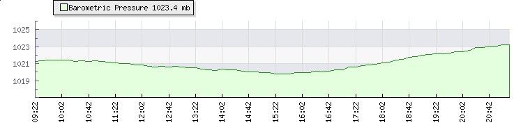 | Wind Speed: | 0|7|15 kmh | Wind Direction: | NW 312° | Temperature: | 21.2°C |  | Wet Bulb: | 13.9°C | Discomfort: | 76 | Humidity: | 44% |  | Rainfall Today: | 0mm | 12 hrs Rainfall: | 0mm | 24 hrs Rainfall: | 0mm |  | Barometer: | 1021mb | Dew Point: | 8.5°C | Clouds AGL: | 5098ft (1554 m) |  | Density-Alt: | 1818ft (554 m) | Fire Danger: |  |