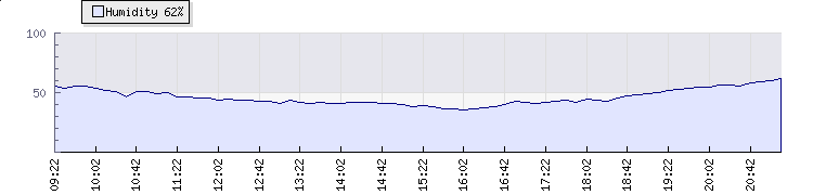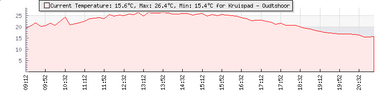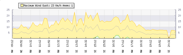 | Wind Gust: | 23 km/h | Min Temp: | 12 °C | Max Temp: | 26.4 °C |  | Wind Average: | 12 km/h | Min Hum: | 36 % | Max Hum: | 87 % |  |    |