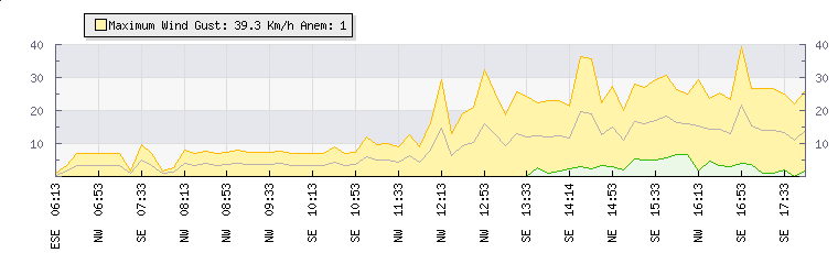 In the last few minutes the wind was South Easterly at an average speed of 22 kmh, reaching up to 39 kmh and a low of 4 kmh. The gust strength is35 kmh above the minimum speed |