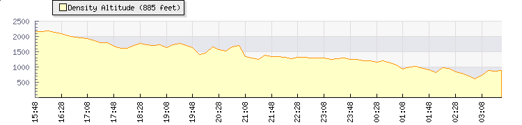 | Wind Speed: | 4|22|39 kmh | Wind Direction: | SE 132° | Temperature: | 25.6°C | | Wet Bulb: | 21.1°C | Discomfort: | 92 | Humidity: | 67% | | Rainfall Today: | 0mm | 12 hrs Rainfall: | 0mm | 24 hrs Rainfall: | 0mm | | Barometer: | 1013.2mb | Dew Point: | 19°C | Clouds AGL: | 2638ft (804 m) | | Density-Alt: | 2723ft (830 m) | Fire Danger: | |